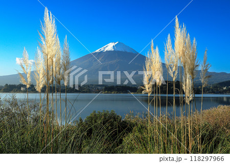 山梨郡河口湖町河口湖大石公園蒲葦與富士山的初秋景色