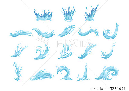 Set of blue waves and water splashes, wavy symbols of nature in motion vector Illustrations