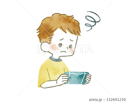 一個孩子在玩遊戲,臉上帶著憂慮的表情──水彩畫