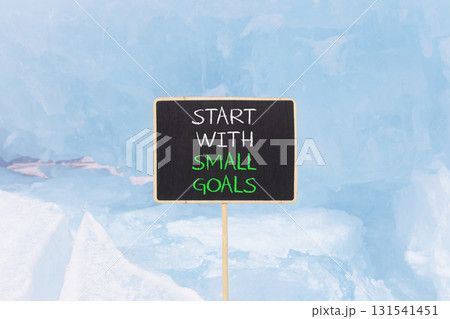 Start with small goals symbol. Concept words phrase Start with small goals on beautiful black blackboard. Beautiful blue ice background. Business Start with small goals concept. Copy space.
