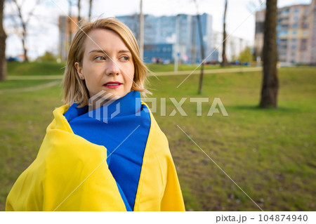 Outdoor portrait of young woman with Ukraine flag outdoors in city park. The concept of freedom.