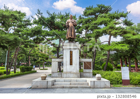 Bronze statue of Korean independence activist Son Byeong-Hui (Uiam) stands atop a stone pedestal, surrounded by pine trees along a peaceful walkway in a well-maintained public space
