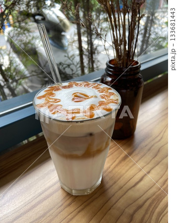 木桌上的冰焦糖瑪奇朵