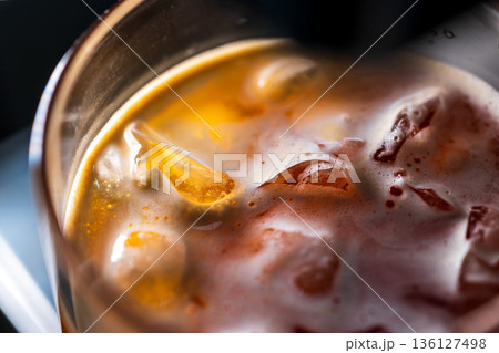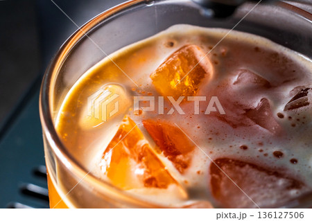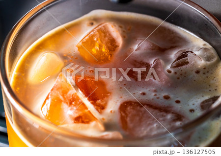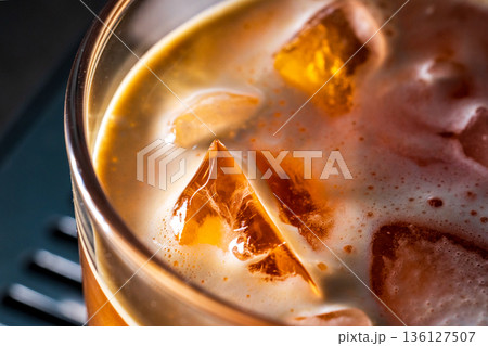 微距視角下的冰咖啡在玻璃杯中與冰塊