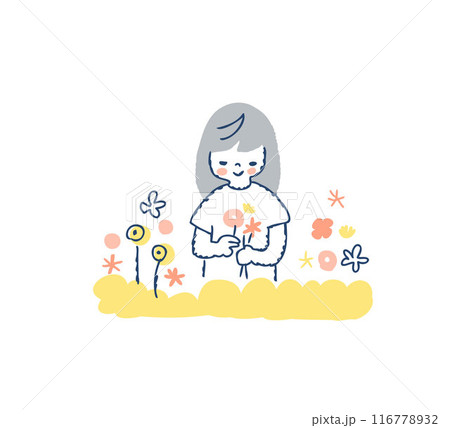 一位女性角色正在興致勃勃地往貼紙書裡貼貼紙——可愛的手繪線條畫——Shirukatsu