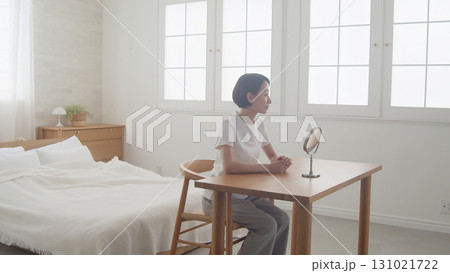 一位年輕的亞洲女性在化妝時對著鏡子感到沮喪(皮膚粗糙、皮膚問題、壓力)