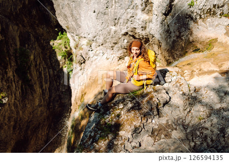 Smiling female traveler with yellow backpack enjoys waterfall near a mountain river. Nature concept.
