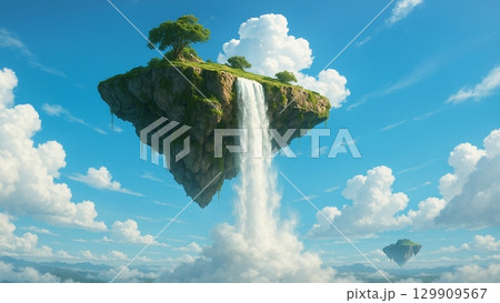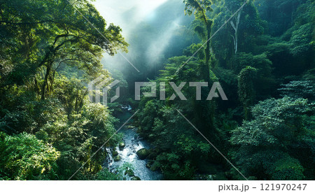 waterfall in summer scene, bright sunrise shining on the waterfall
