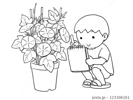 一個男孩蹲下來觀察牽牛花