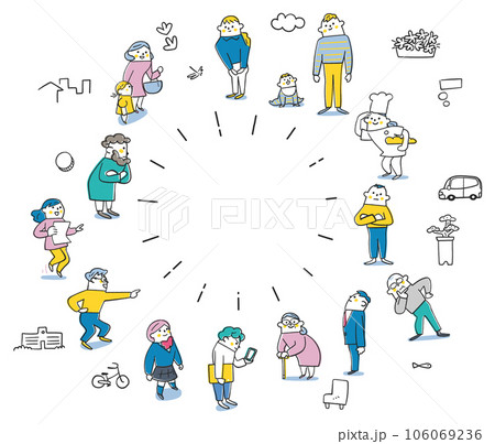 4人一組,圍繞著中心的光,做出各種手勢插畫素材