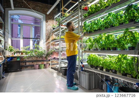 Male florist in flower shop examines potted Genovese basil on shelves. Plant business, selling herbs