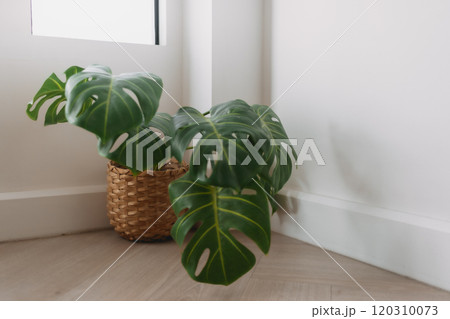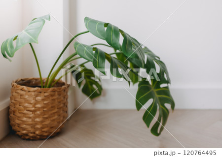 Monstera plant in wooden basket decorated at the corner minimal white room.