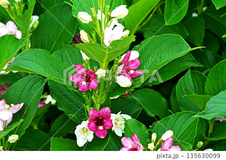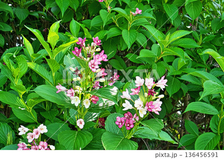 A cluster of delicate pink flowers of Weigela hybrid Rosea in full bloom