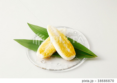 竹葉包裹的魚餅配紫蘇葉,置於盤中 [白色背景,摳圖]
