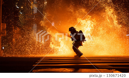 firefighter leaps through flames, showcasing bravery and action