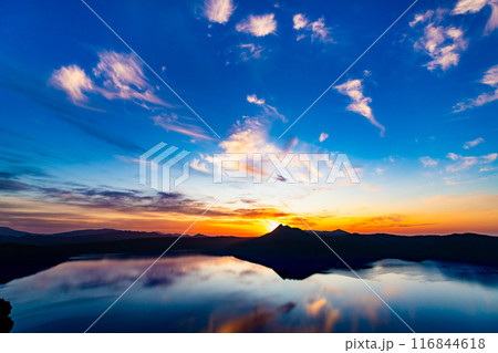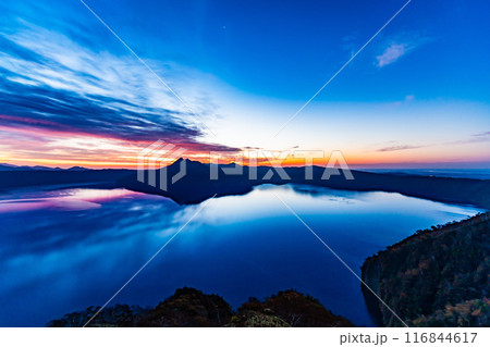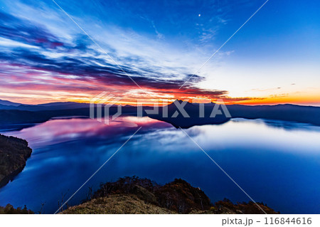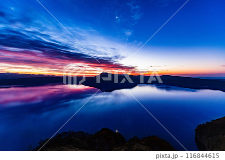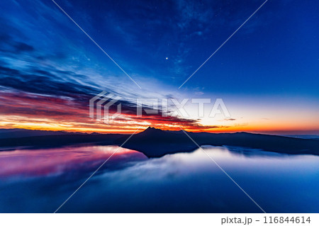 黎明前從箱根隔蘆湖眺望白雪皚皚的富士山