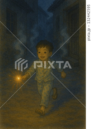 穿睡衣的男孩夜晚玩仙女棒插畫
