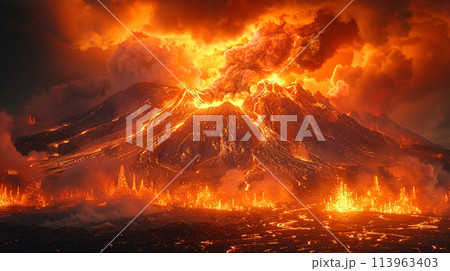 Prehistoric era landscape with volcano and dinosaurs in tropical forest, vector background. Dino park poster for Jurassic lizards and reptiles of museum exhibition for kids in jungle forest