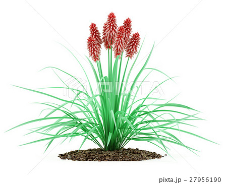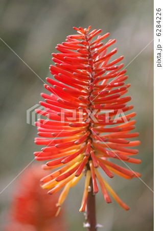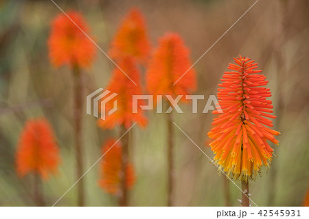 Kniphophia Uvaria. Orange yellow Torch Lily blooming plant. Red Hot Poker flowering in spring garden. Single beautiful exotic flower bud in forest.