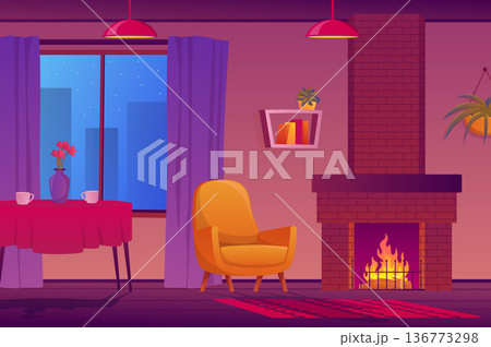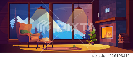 Fireplace room interior at chalet house at night background banner for game design. Cosy living room with chair, cat on couch, warm lights, huge window with mountains view. Vector cartoon illustration