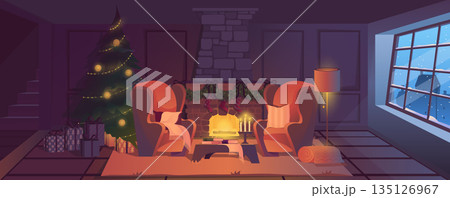 Christmas living room background for banner design. Empty room interior with warm fireplace, armchairs with pillows, festive trees and gift boxes, window with winter view. Vector cartoon illustration