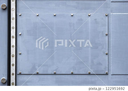close up of Metal door surface with rivets attach on Grey Polished concrete Grunge textured wall background, Rivets on gray metal.