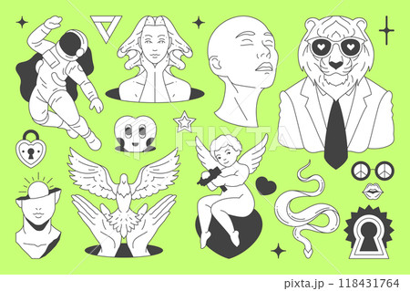 Y2k comic surreal retro groovy line icon psychedelic tattoo concept set vector flat illustration