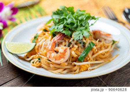 泰國菜 Pad Thai。炒米粉,蝦和蔬菜。