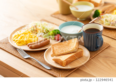 早餐形象(白麵包、吐司、炒蛋、維也納、咖啡)