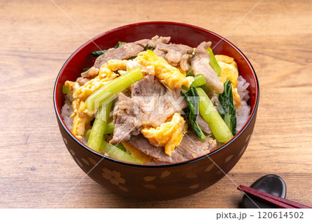 Traditional dish of mashed potatoes with fried pork cutlet and scrambled egg