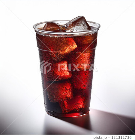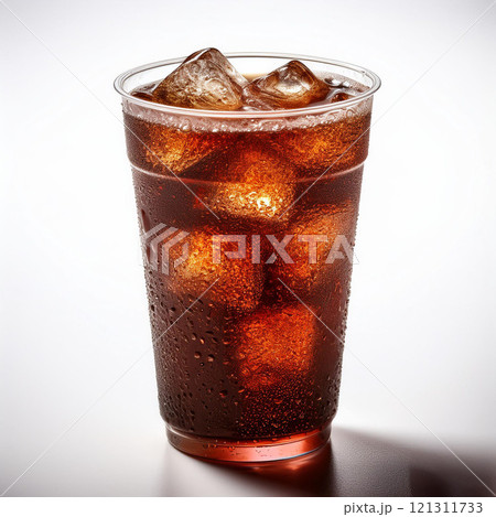 Bubbling soda with ice, dewy droplets and a hyper realistic extreme close up view