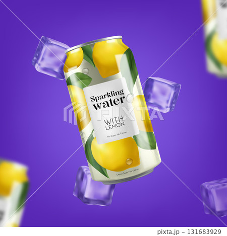 Sparkling Lemon Water Beverage Can on Vibrant Background with Ice
