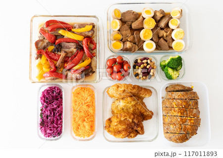 預先準備好的菜餚裝在玻璃儲存容器中,排列在窗邊的桌子上