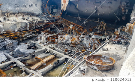 Destroyed Russian military equipment, destroyed armored car. War in Ukraine. Fragment of a rusty burnt car. Salon armored car armored personnel carrier. Remains of military equipment
