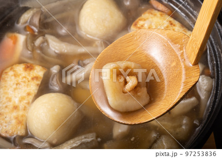 放有很多配料的味噌湯和豬肉湯。材質有高麗菜、豬肉、九條蔥、紅蘿蔔、香菇、姬菇、洋蔥、豆腐。