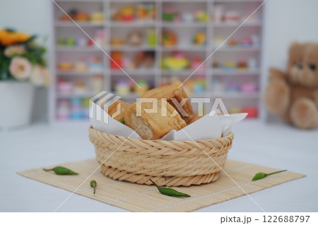 Tahu Bakso, Indonesian traditional snack made from tofu and beef. Served in rattan basket.