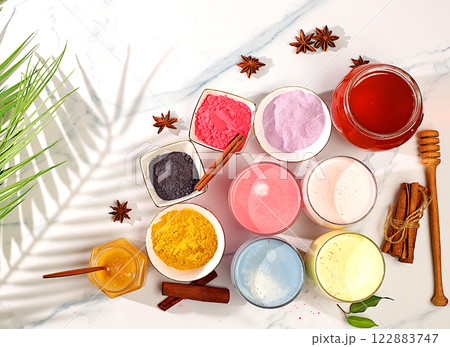 An assortment of colorful matcha lattes, Japanese tea, golden turmeric, lavender blue and pink moon milk. The trendy healthy drink promotes weight loss, a relaxing drink before bed and has