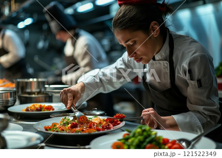 A chef meticulously plating a colorful dish in a bustling kitchen, showcasing culinary artistry and passion.