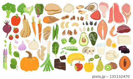 Collection of hand drawn food illustrations isolated on white background. Bundle of fresh delicious vegetables, fruits, dairy, fish and meat. wholesome healthy food.