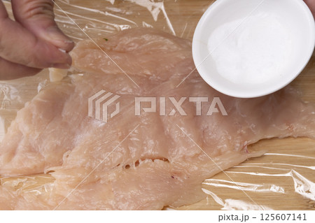 雞肉火腿的製作工序:雞胸肉搥打、拉伸、捲製、熟透。