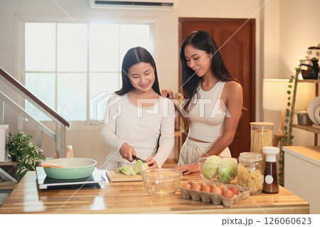 Smiling mother and daughter preparing a healthy meal together in a cozy kitchen at home