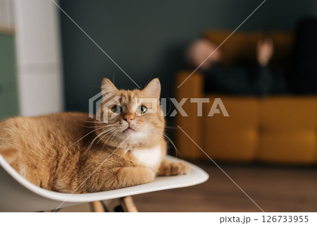 Cute ginger cat lying on modern white chair in cozy living room, while unrecognizable owner relaxing on comfortable sofa in blurred background, enjoying peaceful moment at home.
