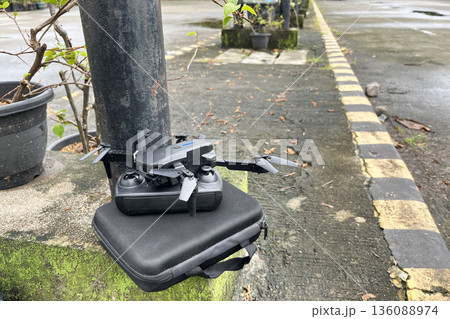 compact foldable drone and remote control resting on a black travel case outdoors on a damp concrete ledge, ready for flight