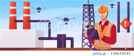 Drone operator using remote control on manufacture or factory, vector flat UAV engineer in an orange helmet and vest