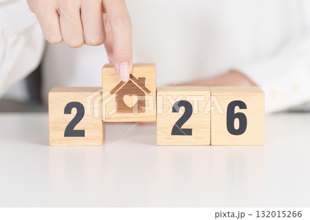 2026 with Home and Heart block. Property investment, House Mortgage, Real Estate tax, homeless, donation, Financial and happy family concepts