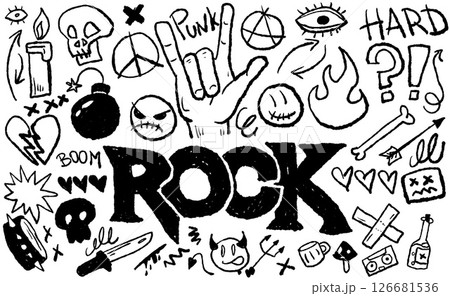 Rock doodle illustration with punk elements and hand-drawn style. Grungy music-related symbols with rebellious energy.