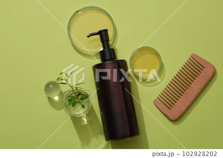 Cosmetic amber bottle unlabeled containers shampoo on green background with glassware containing essence, green leaf and comb. Mockup for design