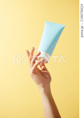 A model hand gently lifts the bottom of an unbranded yellow tube of cream and shows it in a dark blue background resembling a sunny sky, creating the premise for a template of sunscreen advertisement.