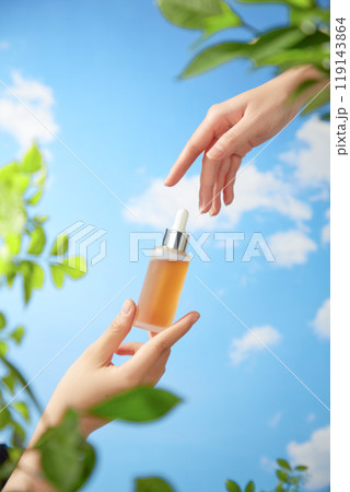 The template photo features a hand gently reaching up a dark brown serum bottle mockup for another hand to catch in the backdrop of a clear blue sky alongside fresh green tree branches in the sunlight