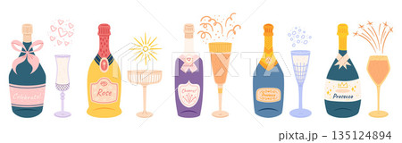 Champagne Bottles And Wineglasses, Sparkling Wine, Effervesces With Celebration. It Gracefully Fills A Wineglass